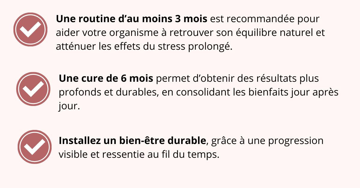 Les effets plus profonds — équilibre hormonal, énergie stable, meilleure gestion du stress — apparaissent souvent après 2 à 3 semaines d’utilisation régulière.